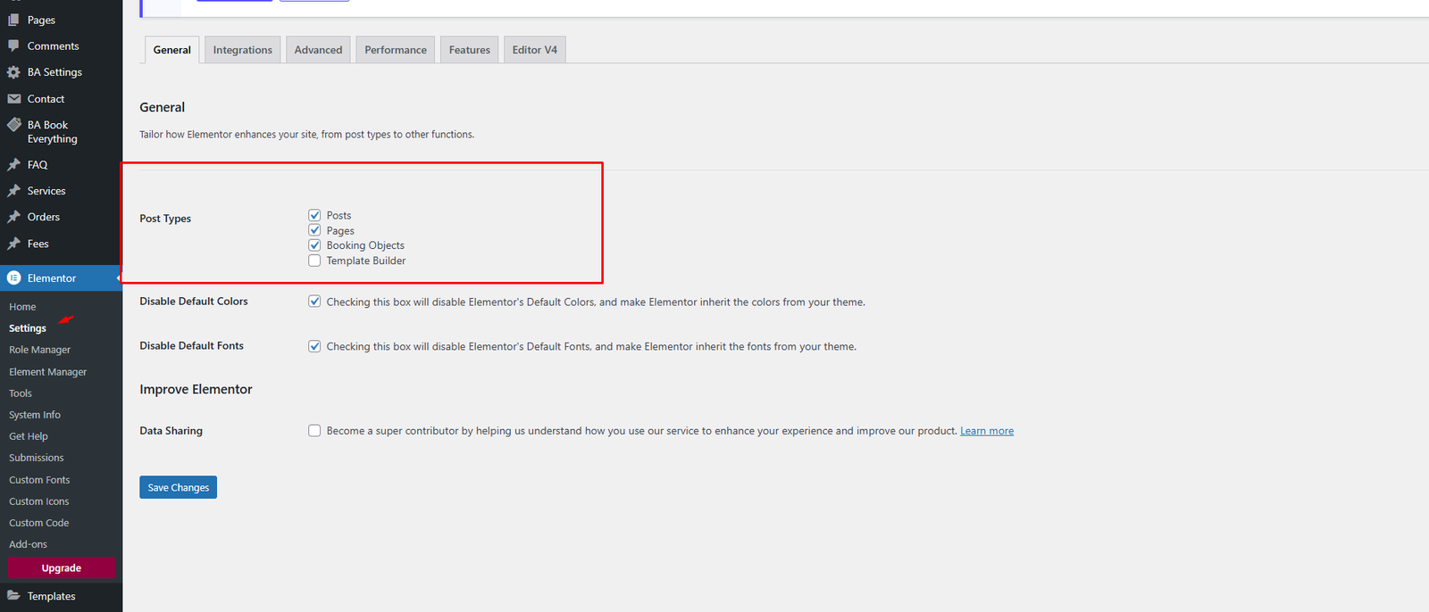 Step 2 — Tick the post you want to edit with Elementor in the Post Types section and click the Save Changes button.
