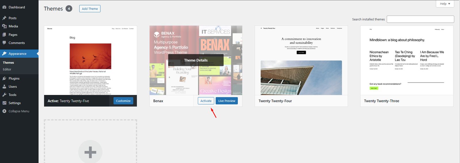 - Navigate to Appearance > Themes Activate another theme to deactivate the Benax theme