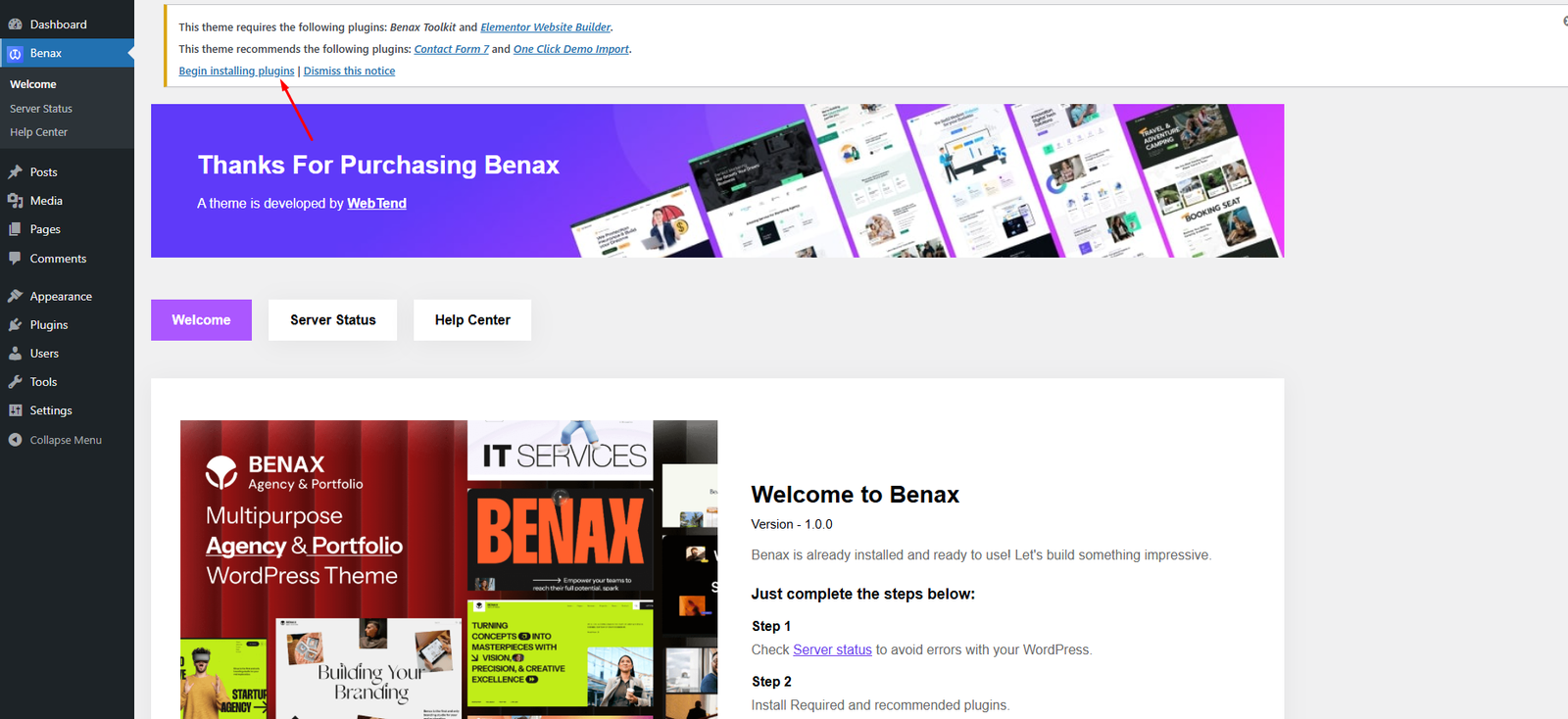Right after the theme was activated, a notification at the top of the screen will suggest to continue with the installation of the plugins recommended for getting the best our of your theme.