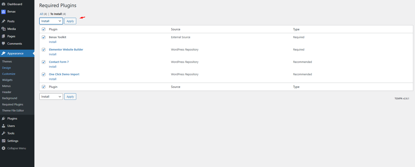Step 2: Select all plugins then choose Install , Click Apply to install all plugins