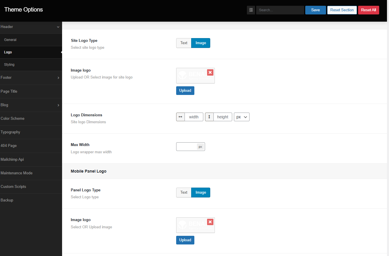 Here you can upload your main logo and mobile panel logo. Also you can use text as your site logo