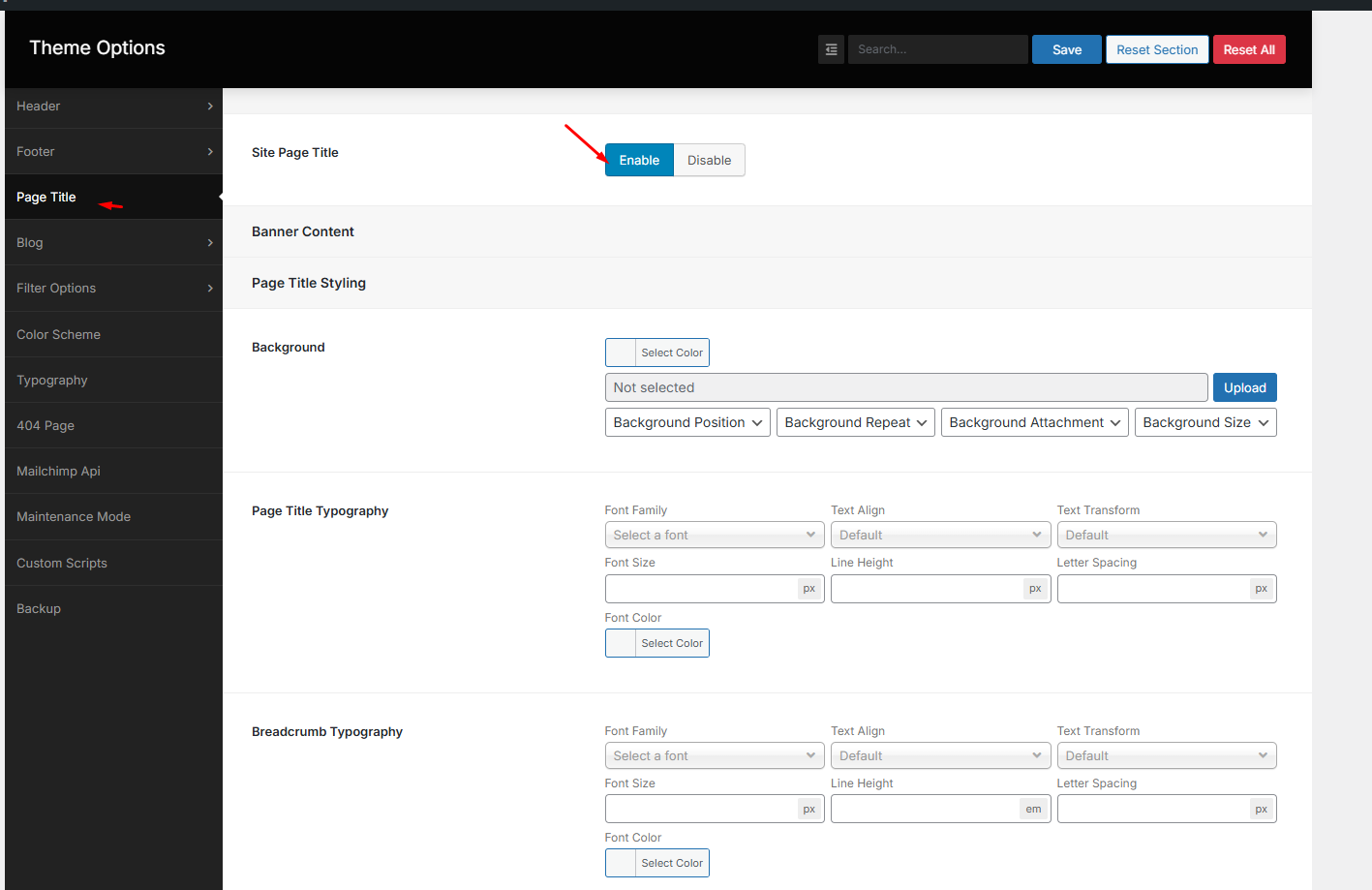 Navigate to the Page Heading from the Theme option. Here you can enable or disable page heading and Breadcrumb