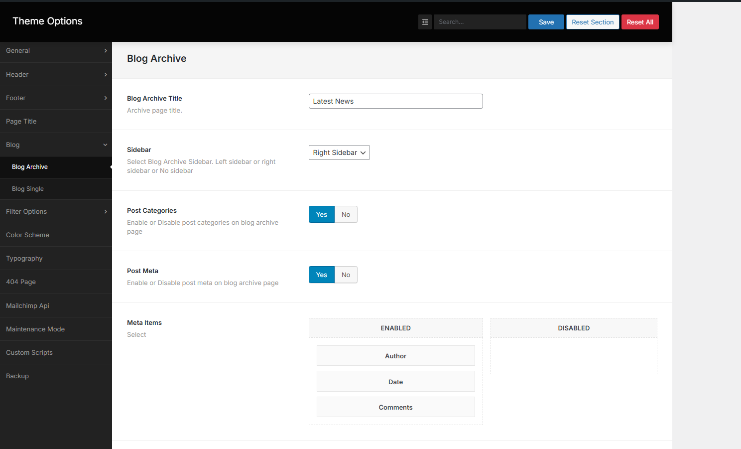 Here you can change blog archive layout. You can also select the Read More text, show/hide Post Meta, Post Author and Post Category.