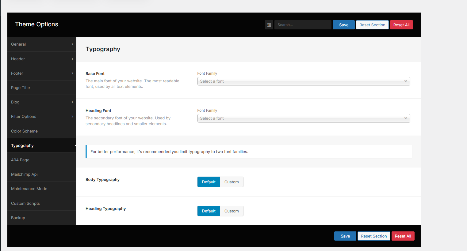 Here you will get the functionality to change the Body, Heading typography. Typography for individual sections can be found with those sections individually. You can select Font Family, Size, Alignment and Color from this section.