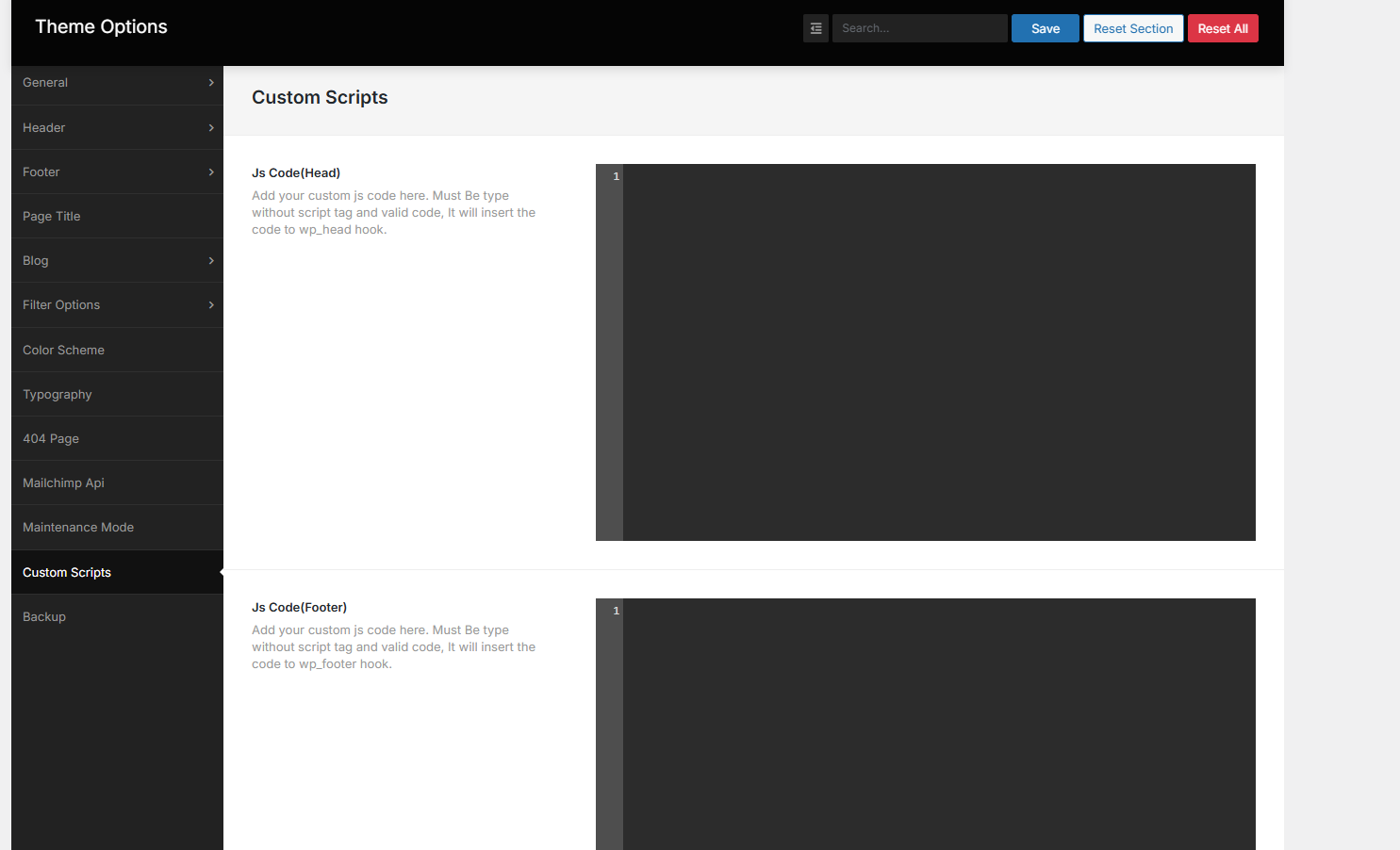Here can add custom scripts(js code). Must Be type without script tag and valid code