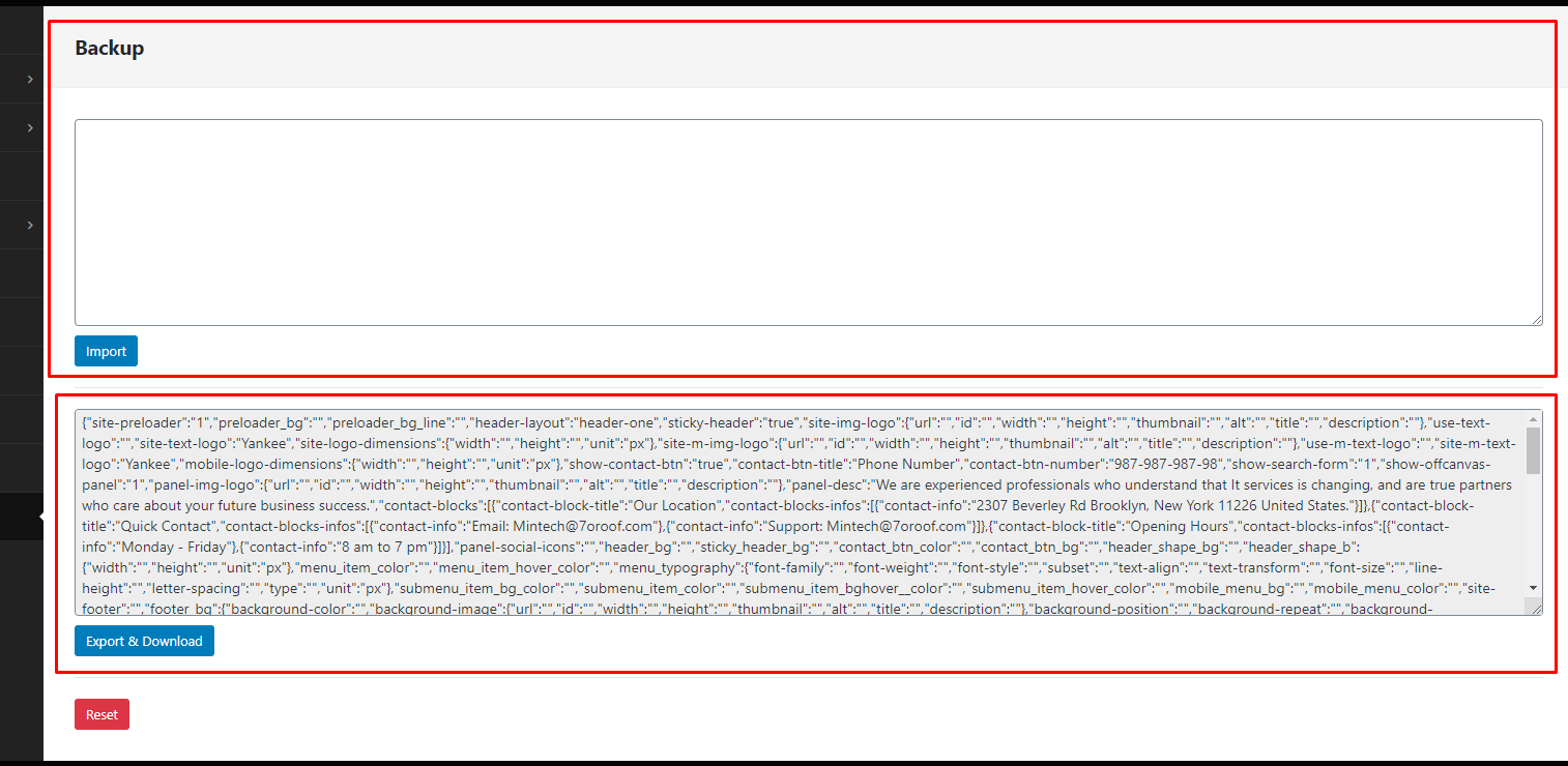 From this section you can download the backup of the theme settings and also import previously saved theme settings.