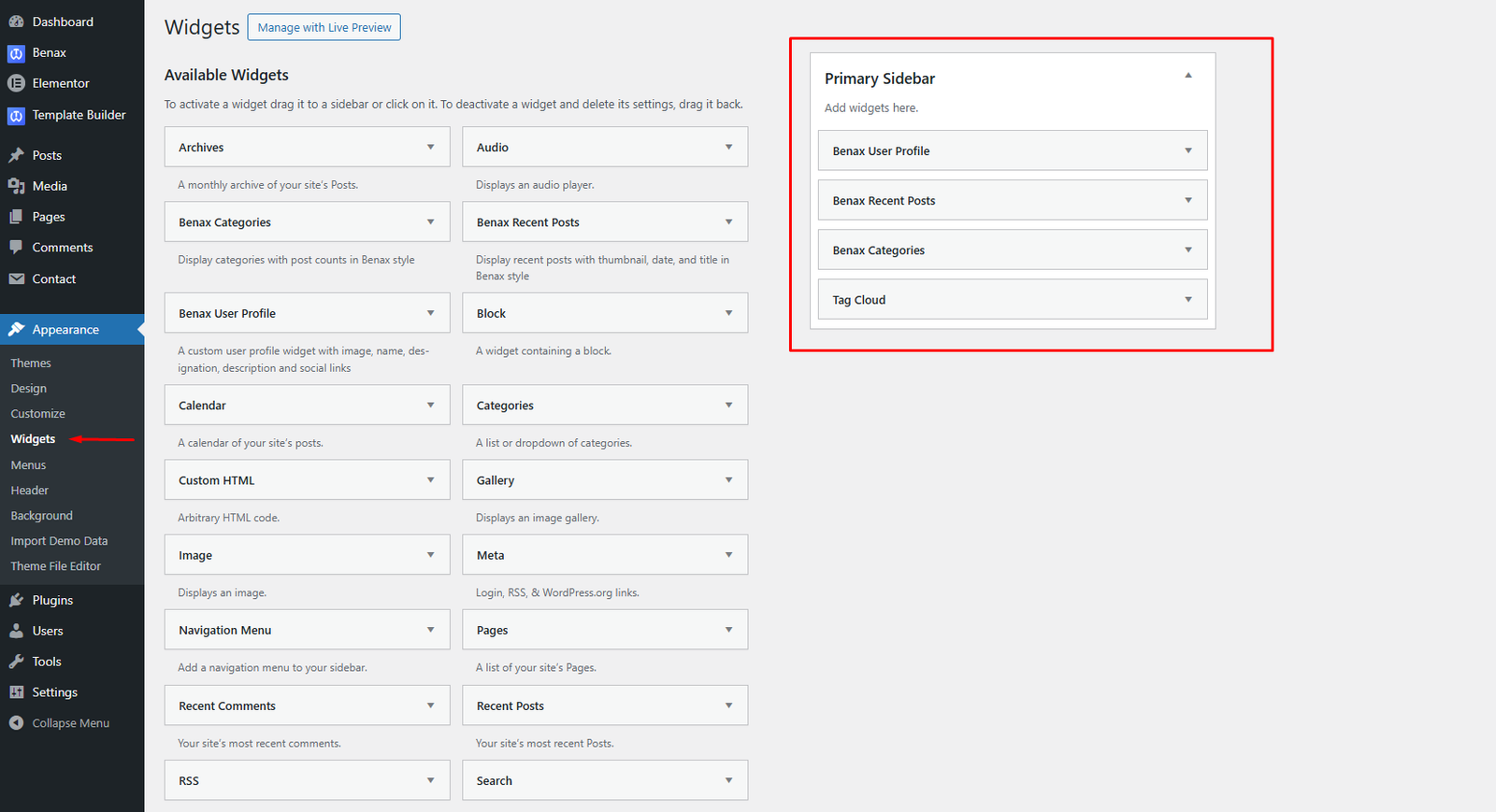 The theme supports multiple location sidebar areas. Navigate to Appearance > Widgets to see available sidebars and widgets, to set overall site sidebar’s you will need to add some widgets inside your Primary Sidebar area. The primary sidebar area’s widgets will show on the blog sidebar; like below shot: