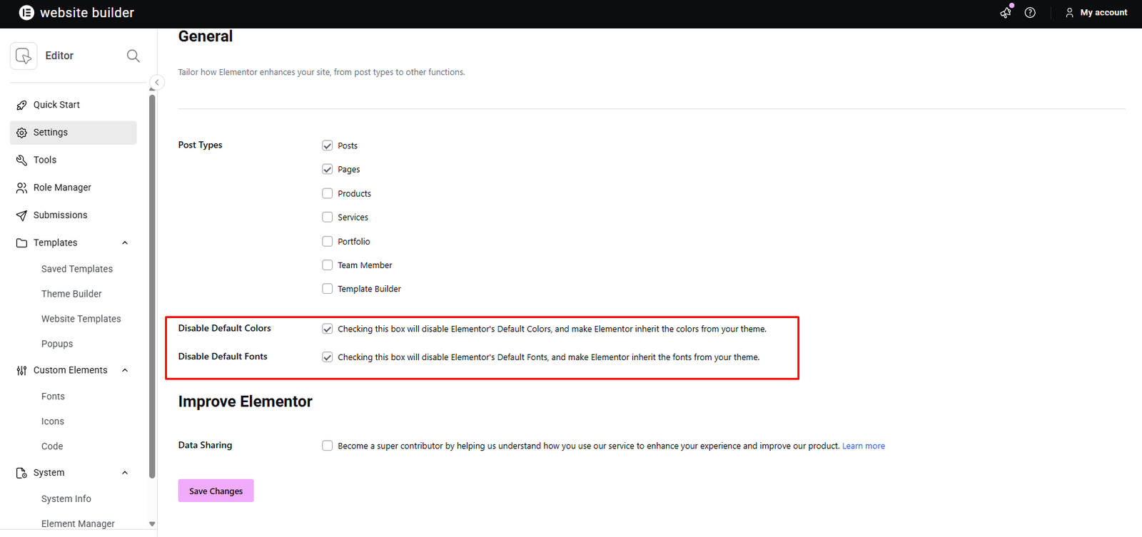 How to disable Elementor default color and fonts?