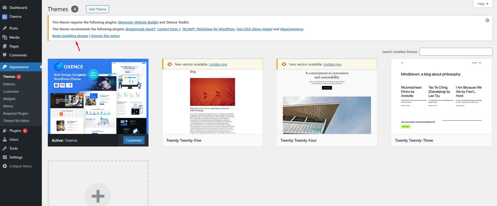 - It will take longer time to replace all files. After the theme files are replaced, login to your WordPress dashboard and you will see the updated version change log. You have to update the Oxence core plugin as the same theme version of the theme to ensure the compatibility between the theme and core plugin. When there is a new update available for the plugin, you will find the plugin update notice in the dashboard.