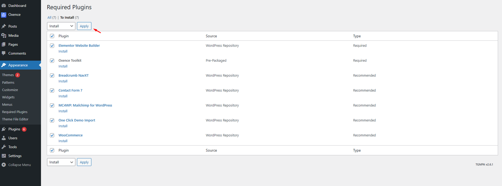 Step 2: Select all plugins then choose Install , Click Apply to install all plugins