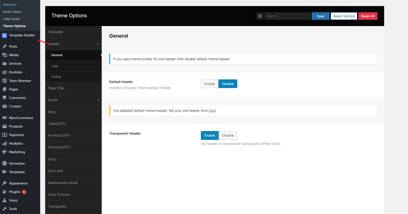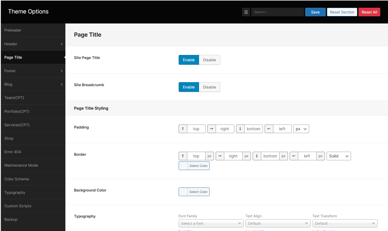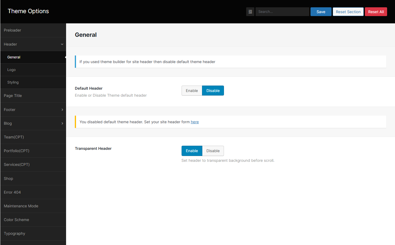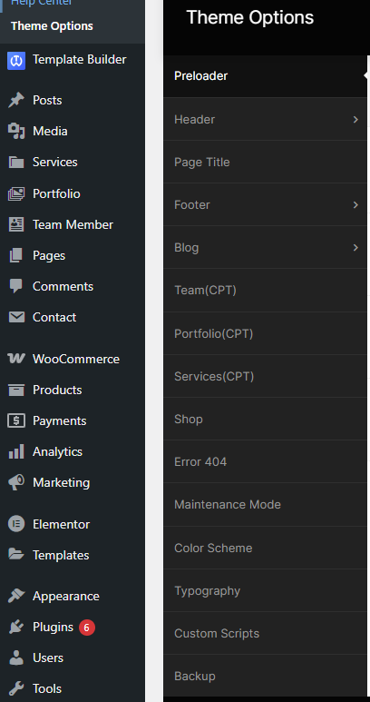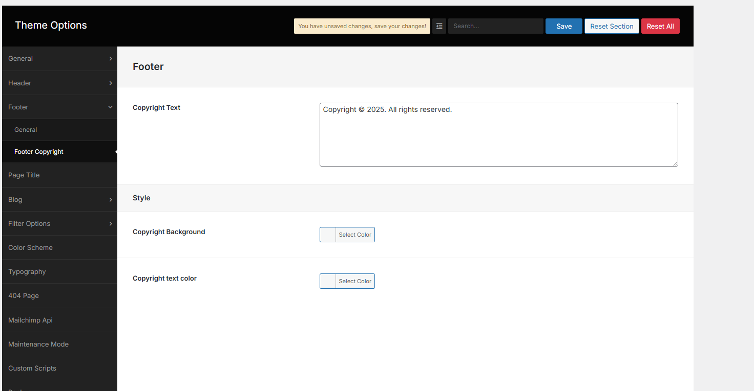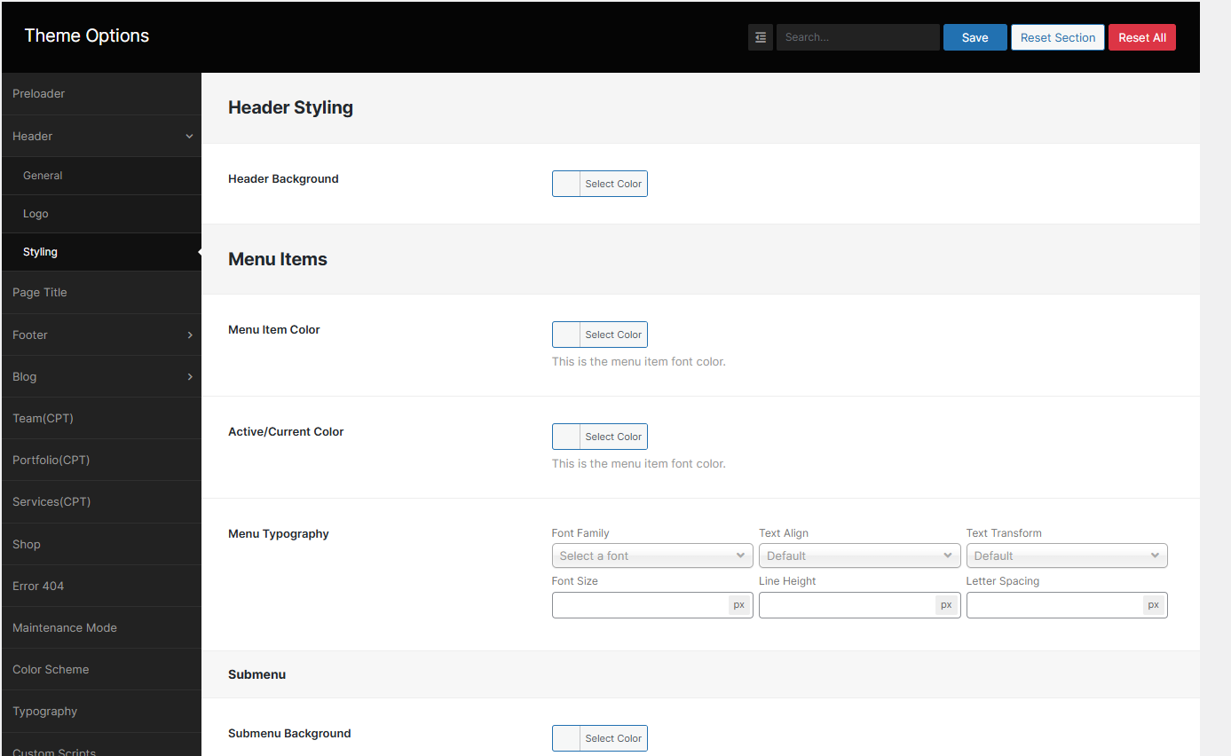 From the Theme options, you will have more customization options for the following elements in your website.