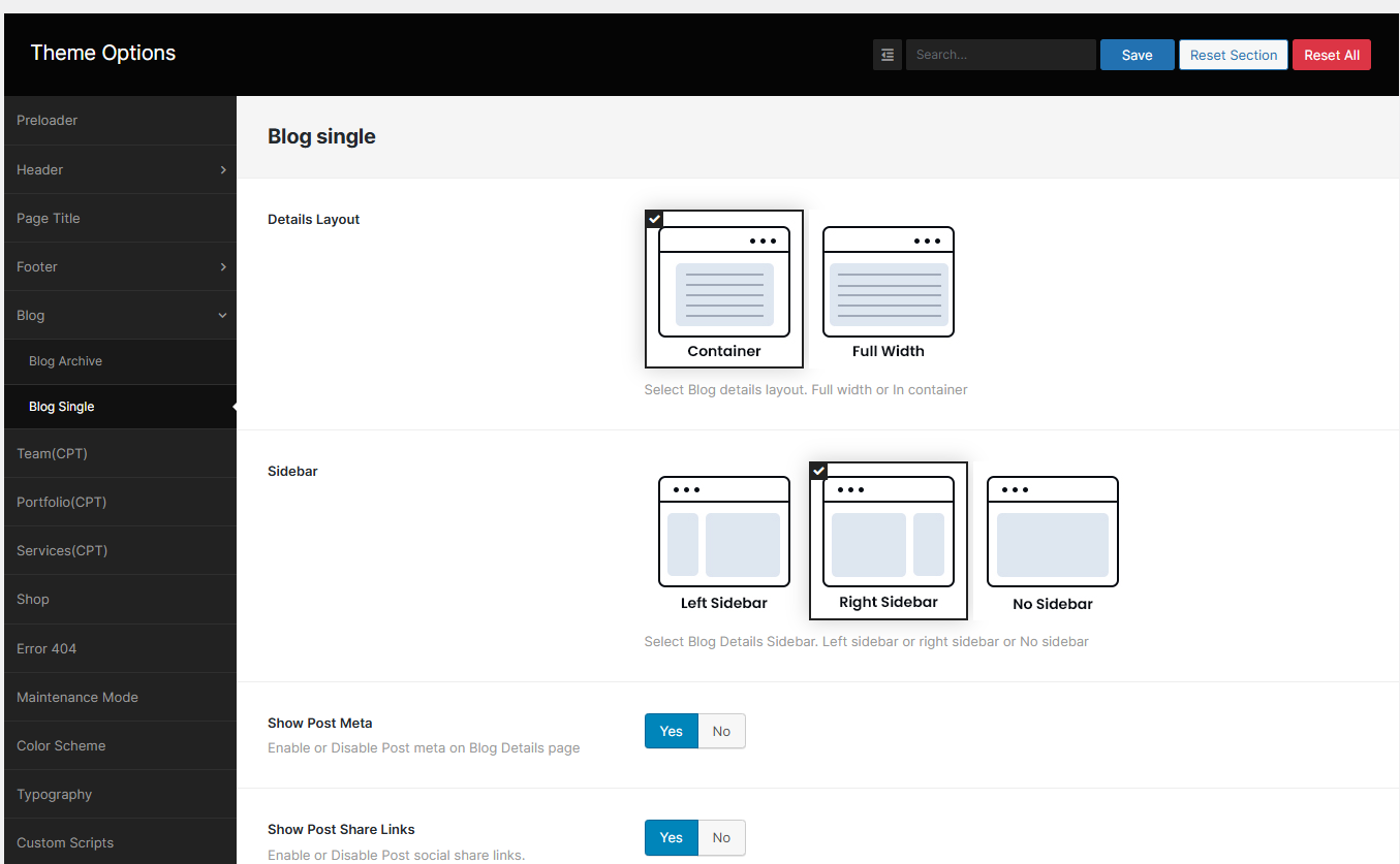 Here you can change blog archive layout. You can also select the Read More text, show/hide Post Meta, Post Author and Post Category.