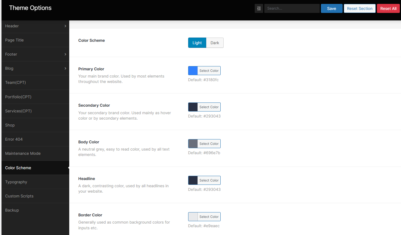 This section you can customize theme color scheme