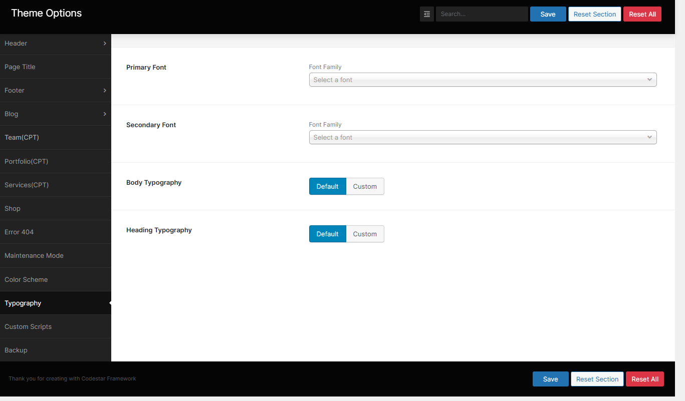 Here you will get the functionality to change the Body, Heading typography. Typography for individual sections can be found with those sections individually. You can select Font Family, Size, Alignment and Color from this section.