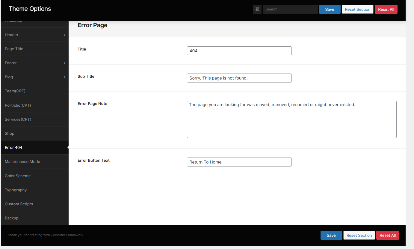 In the 404 Error Page section, You can change error image, title error message