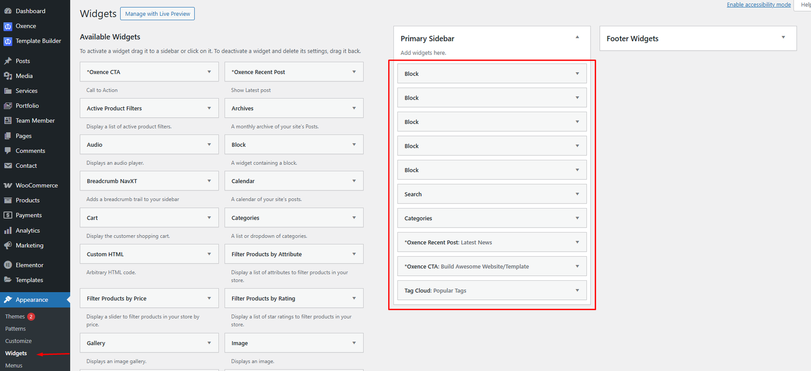 The theme supports multiple location sidebar areas. Navigate to Appearance > Widgets to see available sidebars and widgets, to set overall site sidebar’s you will need to add some widgets inside your Primary Sidebar area. The primary sidebar area’s widgets will show on the blog sidebar; like below shot: